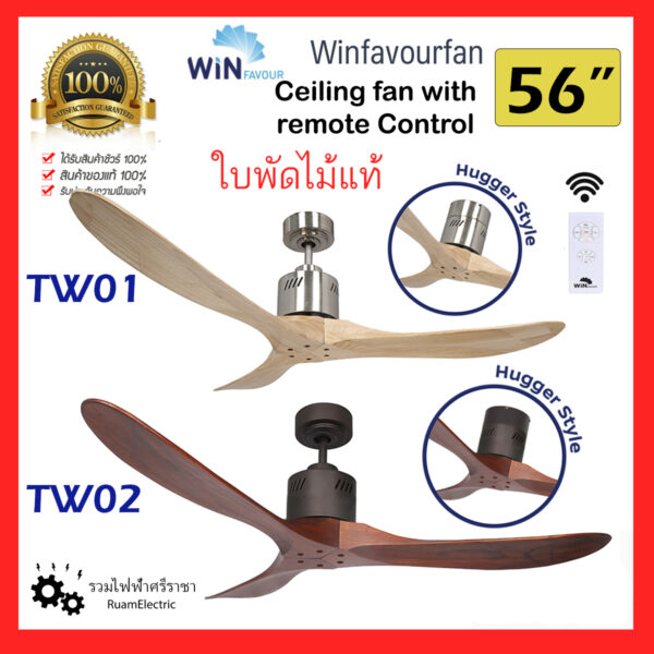 Win favour TW01 TW02 พัดลมเพดาน 3ใบพัด ไม้แท้ รีโมท พัดลมลายไม้ ขนาด56นิ้ว สีน้ำตาล สีนิเกิ้ล รับประกันมอเตอร์10ปี